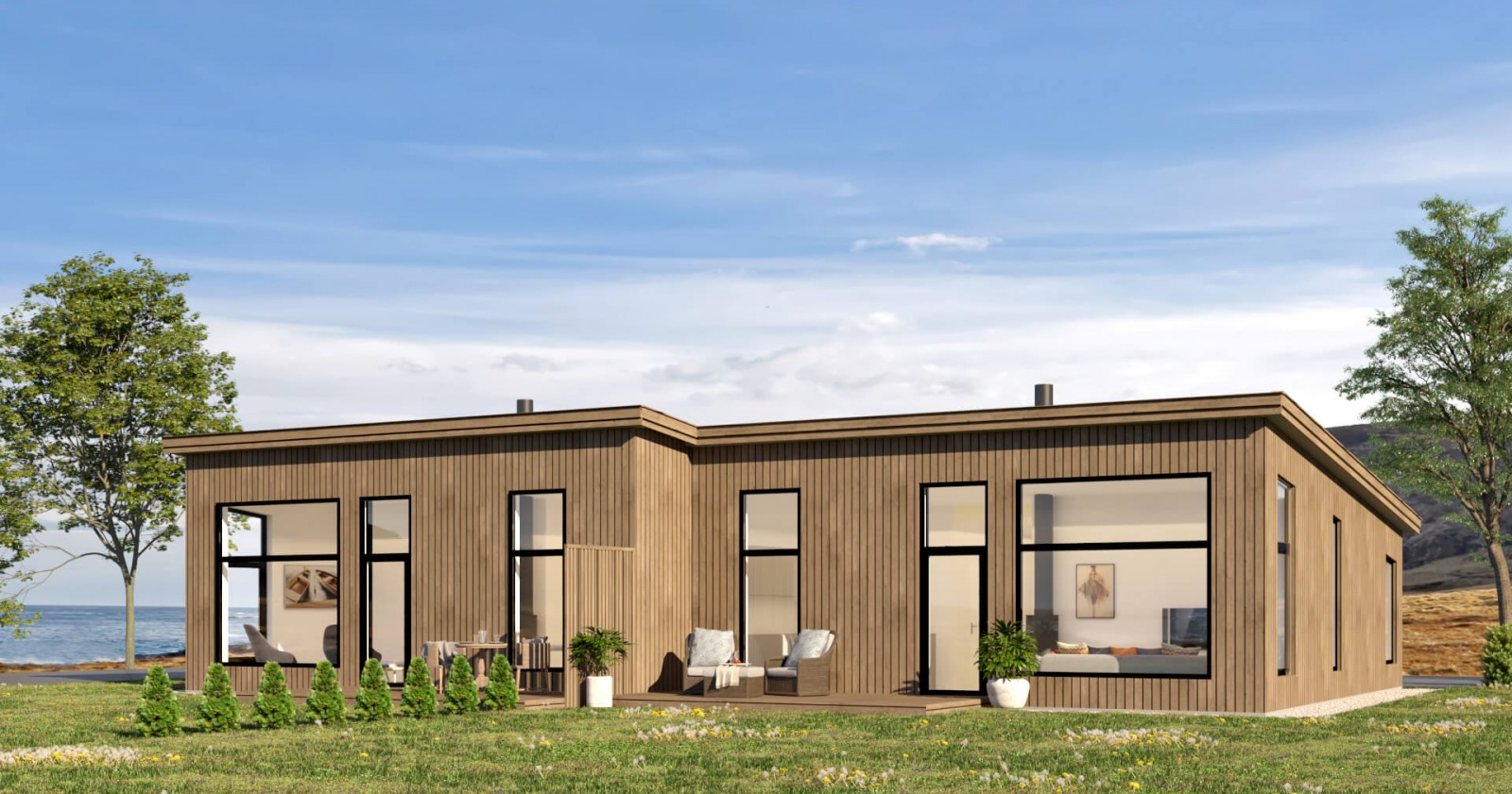 Bolig 1100 består av to moderne leiligheter. Tomannsboligen er oppbygd med to speilvendte leiligheter på 73,6 m2 som inneholder blant annet to soverom, og åpen stue-kjøkken løsning med god takhøyde og store moderne vinduer som gjør allrommet lyst og trivelig. Overbygd inngangsparti og direkte tilgang til terrasse fra stue/kjøkken.