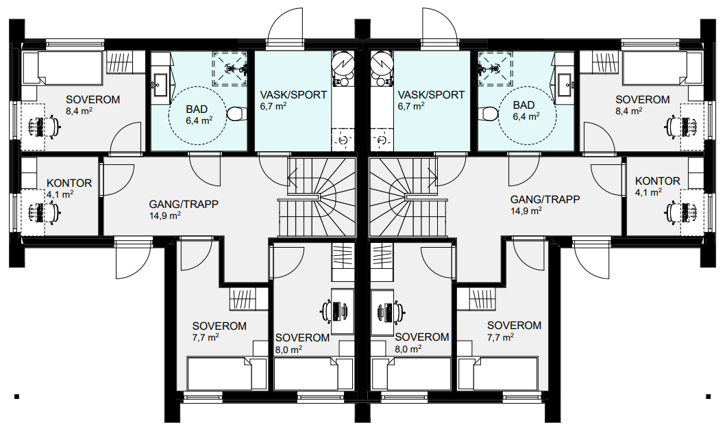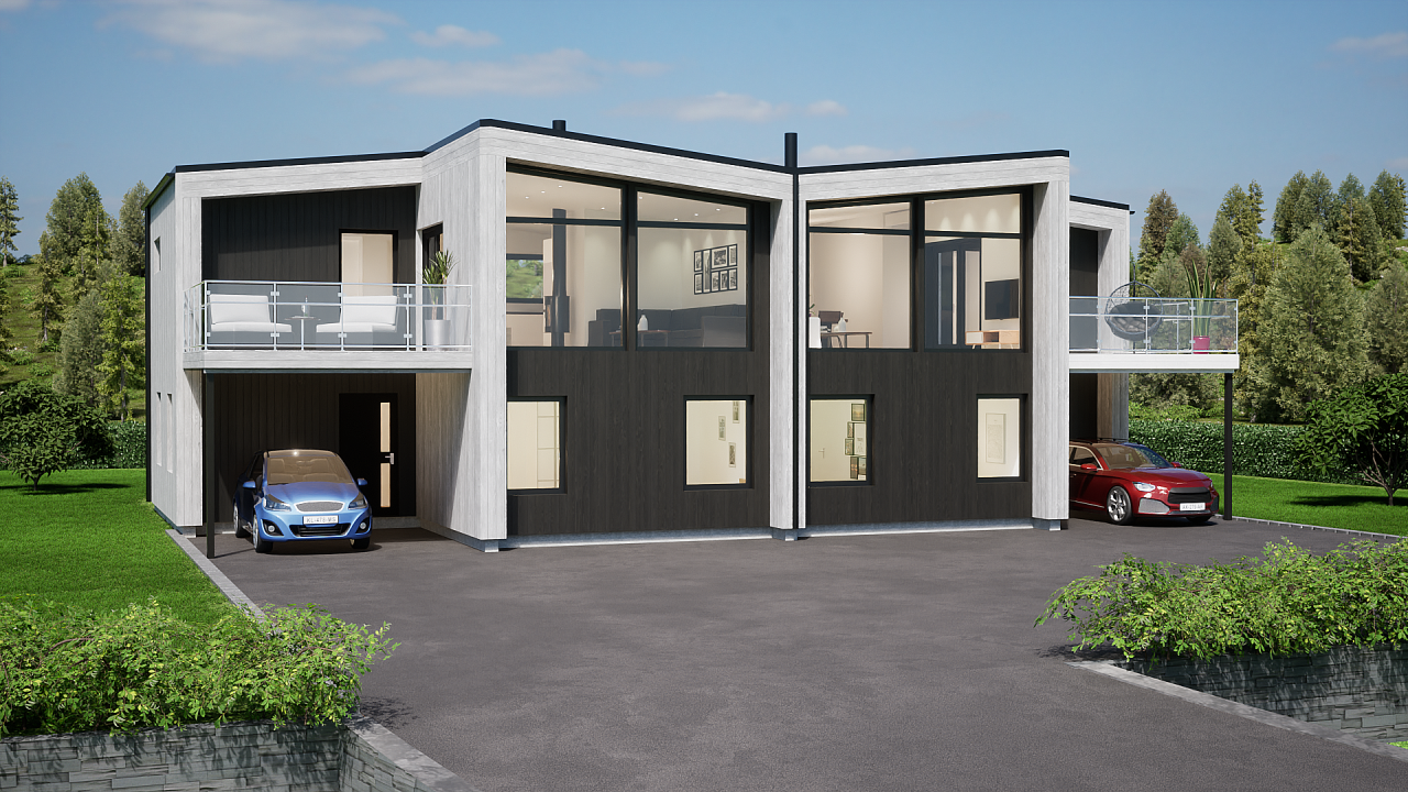 Denne stilrene og moderne tomannsboligen har to identiske boenheter med fire soverom, to bad og et kontor. I tillegg har boligen et praktisk vaskerom med egen utgang. I boligens andre etasje finner du en stor og romslig stue-/kjøkkensone, perfekt for deg som vil samle familie og venner. Herfra kan du også ta deg ut på boligens altan.